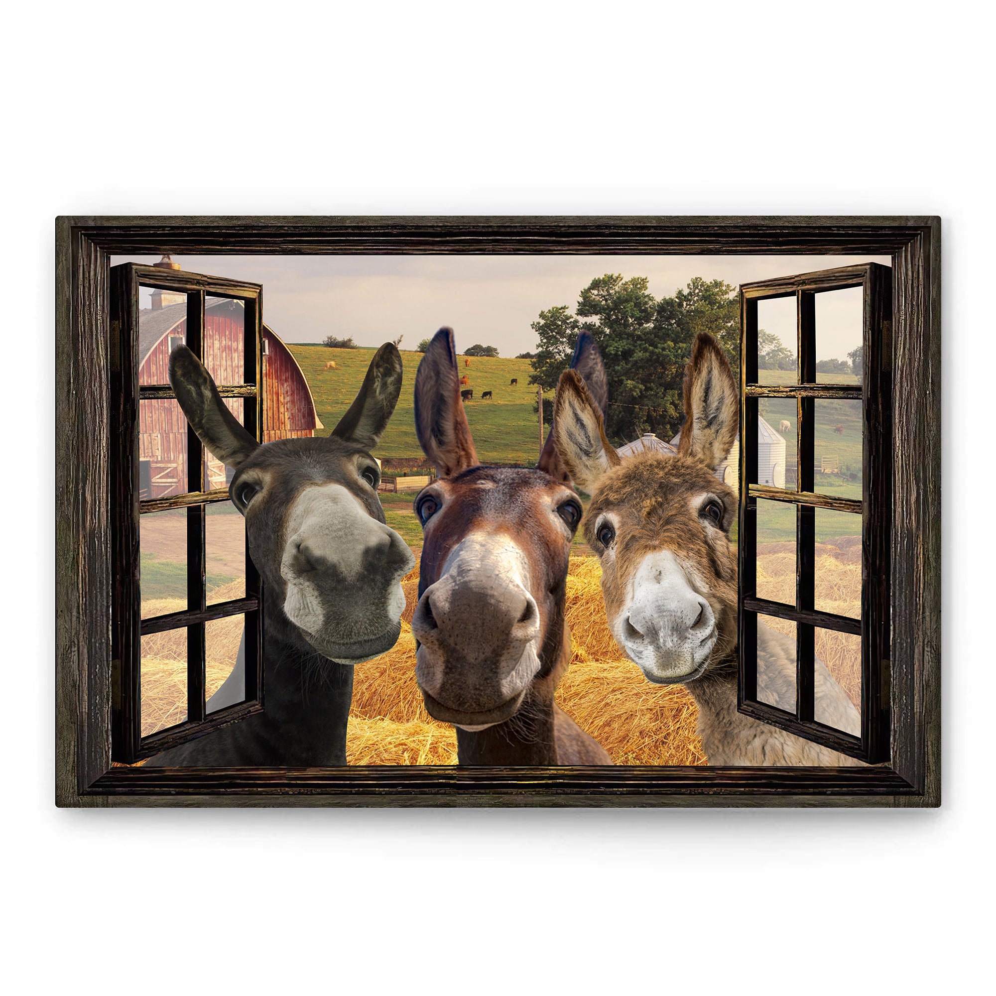 Donkey Poster & Canvas, Funny Donkeys Outside The Window Wall Art, Home Decor