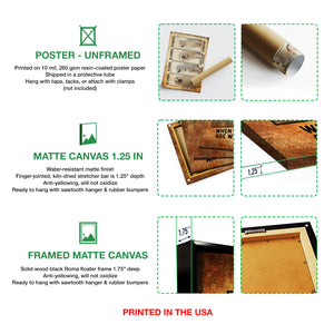 - Framed Matte Canvas: Our framed matte canvas is an excellent choice for anyone looking to make a statement about their personality. The canvas is printed using UL Certified GREENGUARD GOLD Ink and features a museum-quality archival canvas that will not oxidize or yellow over time. The stretcher bar is made of 100% renewable, kiln-dried, knot-free, finger-jointed wood, and the solid wood Black Roma floater frame is 1.75" deep. The canvas comes ready to hang with a sawtooth and rubber bumpers.