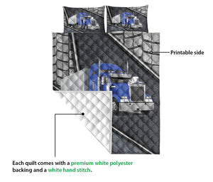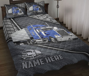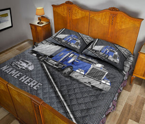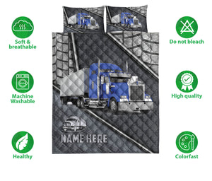 Personalized Trucker Quilt Set, Blue Truck Driver Trucker Silver Quilt Blanket With Pillowcases, Custom Name Quilt Bedding Set