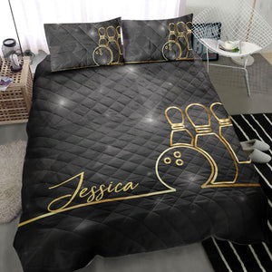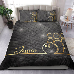 Personalized Bowling Quilt Set, Bowling Pin Bowler Gold Line Quilt Blanket With Pillowcases, Custom Name Quilt Bedding Set