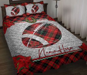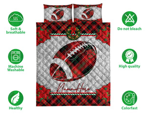 Personalized Football Quilt Set, Christmas Red Plaid American Football Xmas Holiday Quilt Blanket With Pillowcases, Quilt Bedding Set