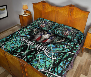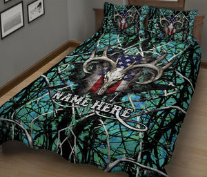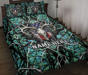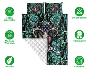 Personalized Hunting Quilt Set, Deer Hunting Green Deer Hunter Quilt Blanket With Pillowcases, Custom Name Quilt Bedding Set