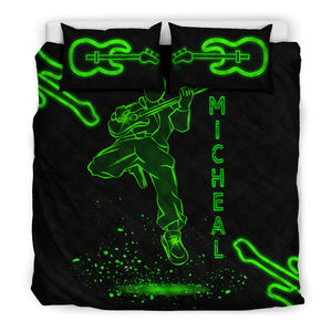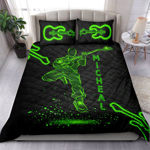Personalized Guitar Quilt Set, Electric Bass Guitarist Neon Green Music Theme Quilt Blanket With Pillowcases, Quilt Bedding Set