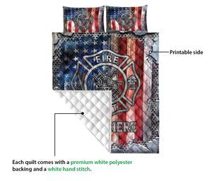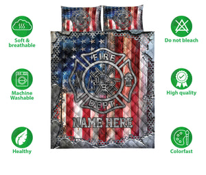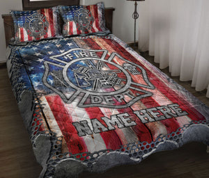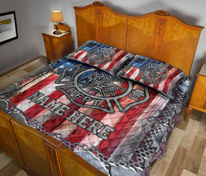 Personalized Firefighter Quilt Set, Firefighter Us Flag Crack Metal Quilt Blanket With Pillowcases, Custom Name Quilt Bedding Set