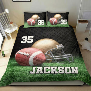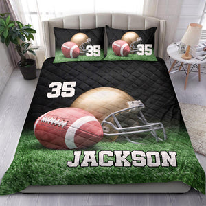 Personalized Football Quilt Set, Football Ball Helmet On Grass Quilt Blanket With Pillowcases, Custom Name and Number Quilt Bedding Set