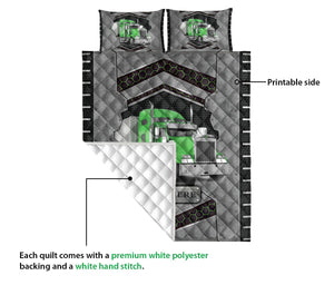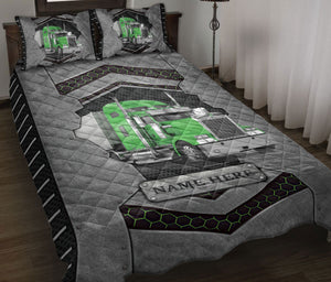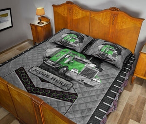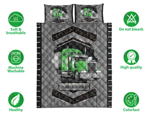 Personalized Trucker Quilt Set, Green Truck Trucker Driver Carbon Stone Quilt Blanket With Pillowcases, Custom Name Quilt Bedding Set