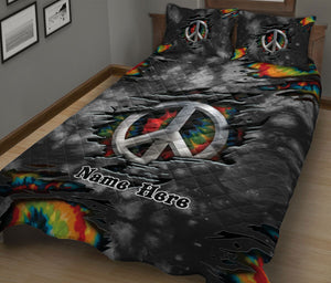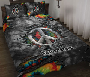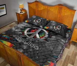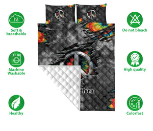 Personalized Hippie Quilt Set, Hippie Peace Sign Grey Colorful Quilt Blanket With Pillowcases, Custom Name Quilt Bedding Set