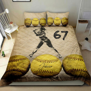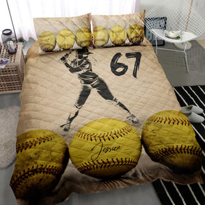 Personalized Softball Quilt Set, Softball Girl Ball Batter Quilt Blanket With Pillowcases, Custom Name and Number Quilt Bedding Set