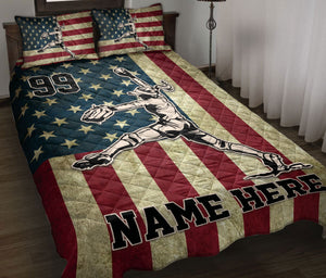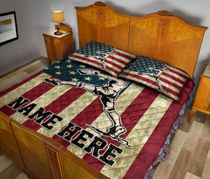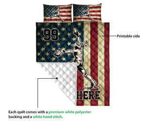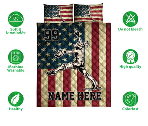 Personalized Softball Quilt Set, Softball Player Pitcher Us Flag Quilt Blanket With Pillowcases, Custom Name Quilt Bedding Set