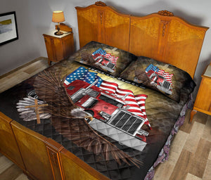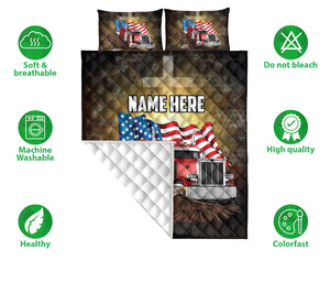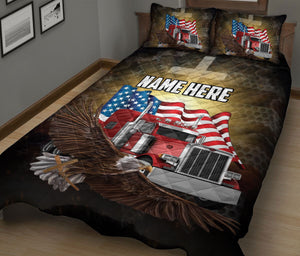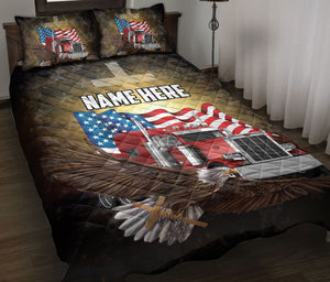 Personalized Trucker Quilt Set, Truck Eagle Cross Us Flag Trucker Quilt Blanket With Pillowcases, Custom Name Quilt Bedding Set