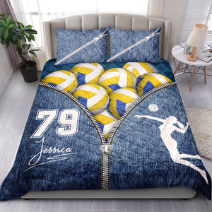 Personalized Volleyball Quilt Set, Volleyball Girl Ball Zip Jean Blue Quilt Blanket With Pillowcases, Quilt Bedding Set