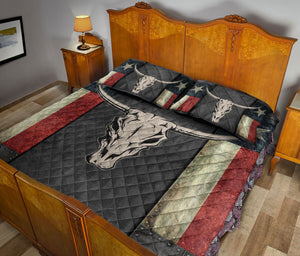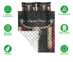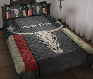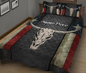 Personalized Skull Quilt Set, Western Texas Cow Skull Texas Flag Wild West Cowboy Quilt Blanket With Pillowcases, Quilt Bedding Set